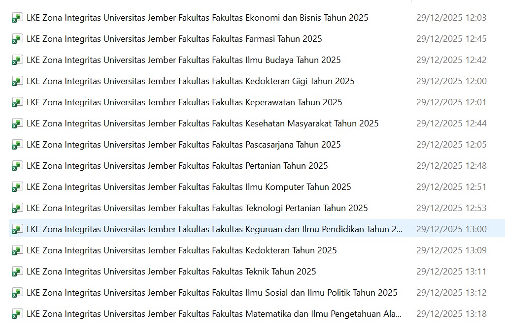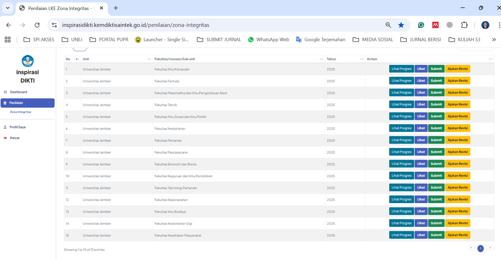 SPI Universitas Jember memiliki 4 reviewer ZI/WBK bersertifikasi selaku Tim Penilai Perguruan Tinggi Negeri (TP-PTN) yang bertanggung jawab untuk melakukan penilaian usulan melalui aplikasi Inspirasi Dikti, yaitu Cempaka Paramita (Divisi SMM-SMAP), Ratih Listyana Chandra (Divisi SDM dan Hukum), Krisnamurti (Sekretaris SPI), dan Nova El Maidah (Divisi Manajemen Risiko). Terkait kegiatan pengusulan ZI WBK/WBBM, Direktur Jenderal Pendidikan Tinggi menerbitkan Surat Nomor 4467/B1/OT.01.02/2025 tanggal 10 Nopember 2025 tentang Pemenuhan Perjanjian Kinerja Pemimpin Perguruan Tinggi Negeri pada Indikator Zona Integritas Tahun 2025. Terkait hal tersebut 15 Fakultas dan 1 Pascasarjana telah mengisi LKE-ZI pada aplikasi https://inspirasidikti.kemdikbud.go.id pada tanggal 28 Nopember 2025. Selanjutnya TP-PTN Universitas Jember melaksanakan penilaian dan telah meminta kepada unit kerja untuk melakukan revisi pada tanggal 8 Desember. Selanjutnya unit kerja akan melakukan revisi dan di submit kembali sebelum tanggal 17 Desember 2025 untuk penilaian ulang oleh TP-PTN yang terdiri dari Cempaka Paramita (Manajemen Perubahan), Ratih Listyana Chandra (Penataan Sistem Manajemen SDM Aparatur), Krisnamurti (Penguatan Akuntabilitas), dan Nova El Maidah (Penataan Tatalaksana), Ika Barokah (Penguatan Pengawasan) dan Luh Putu Indah Budyawati (Peningkatan Kualitas Pelayanan Publik).