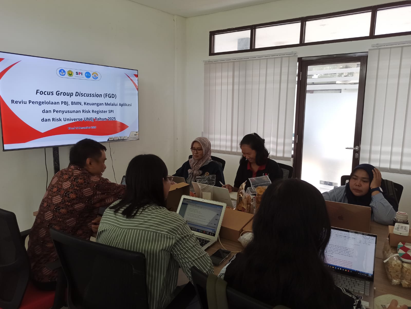 Pada tanggal 12 sd 13 Desember 2025 telah dilaksanakan FGD Kegiatan Reviu Pengelolaan PBJ, BMN, Keuangan melalui aplikasi dan Penyusunan Risk Register SPI dan Risk Universe UNEJ tahun 2025 . Dalam kegiatan ini telah disusun Risk Register SPI dan Risk Universe UNEJ Tahun 2025. Di samping itu juga dilakukan Reviu pengelolaan PBJ, BMN dan Keuangan yang ditinjau dari Aplikasi SIMANGGA, SIMKEU dan OPTIMA/SAKTI.