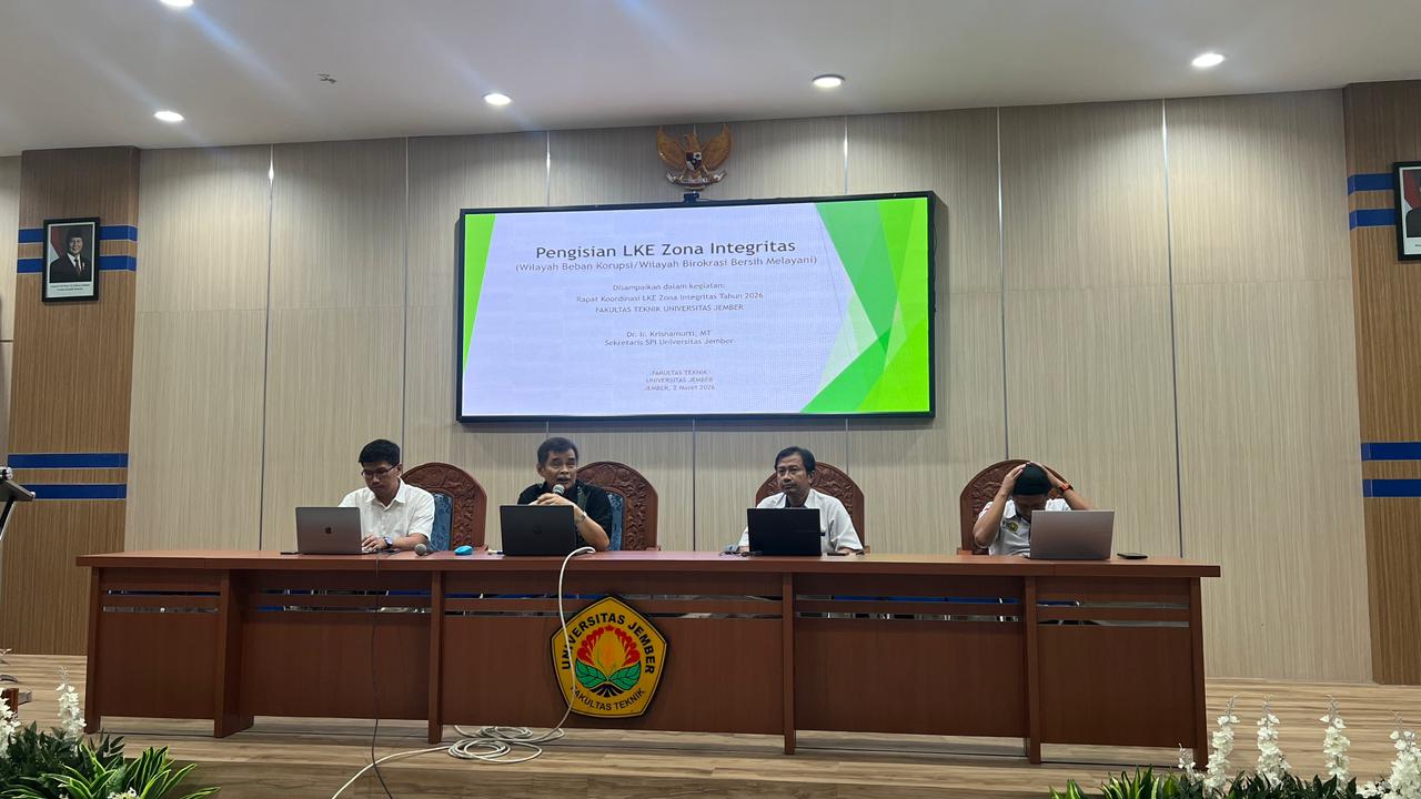 Pada hari Senin 2 Maret 2026 dalam rangka memperkuat komitmen Fakultas Teknik Universitas Jember menuju Pembangunan Zona Integritas (ZI) Wilayah Bebas dari Korupsi (WBK) serta menindaklanjuti komentar dari catatan perbaikan dari TPPTN, telah dilaksanakan kegiatan sosialisasi pengisian LKE ZI pada aplikasi inspirasidikti. Kegiatan ini dilaksanakan di Auditorium Fakultas Teknik Universitas Jember. Selaku narasumber adalah sekretaris SPI. Dalam kegiatan ini disampaikan materi tentang Pengisian LKE Zona Integritas serta pembahasan tentang pemahaman mengenai dokumen-dokumen yang dibutuhkan dalam pengisian LKE ZI dan melengkapi keterangan dalam aplikasi tersebut.